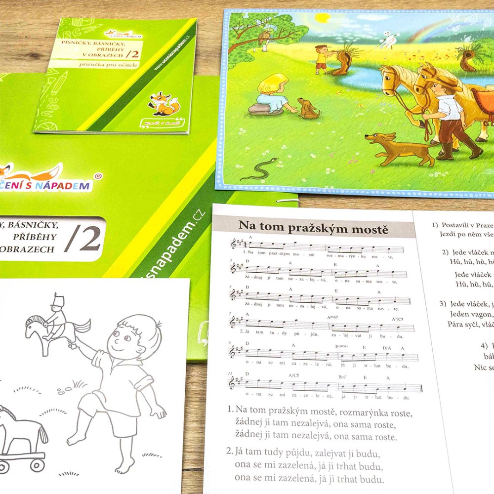 Součástí pomůcky je 12 nástěnných obrazů formátu A3, z toho 6 věnovaných lidovým písním a 6 ilustrovaným příběhům. Najdete zde texty tradičních písní, které patří ke zlatému fondu české kultury, a ilustrace akademické malířky Ivety Autratové. Texty příběhů jsou vhodně zvoleny tak, aby se mohly stát motivačním východiskem k výchově dětí ke vztahu k přírodě, rodině, aby napověděly, jak se mají lidé k sobě chovat. Příběhy napsala Dagmar Pernická a jsou doplněny o příručku pro učitele se zmenšenými obrázky a všemi texty. Nechybí ani omalovánky k opakovanému kopírování, které dětem umožní další tvořivou práci.